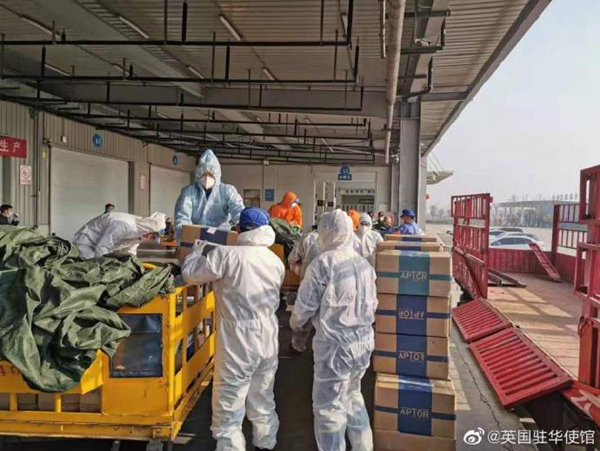 英国政府援助医疗物资送抵中国。图片来自英国驻华大使馆微博账号。