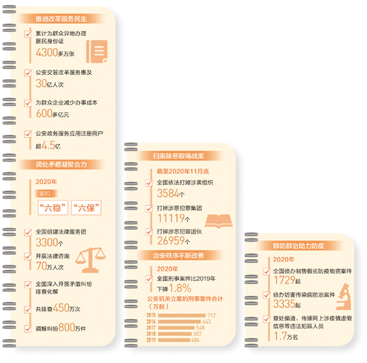 依法严惩违法犯罪,不断夯实平安中国之基。近年来,从深入开展“昆仑”行动守护“舌尖上的安全”,到持续部署“净网”行动构建清朗网络空间,从集中打击整治跨境赌博、长江流域非法捕捞、涉枪爆、涉文物、涉野生动物等违法犯罪,到持续打击电信网络诈骗、非法集资、侵犯知识产权等违法犯罪,一系列重拳出击有效净化了社会治安环境。2020年,全国刑事案件比2019年下降1.8%,8类主要刑事案件同比下降8.7%,立现行命案数同比下降9.3%,治安案件同比下降10.4%。