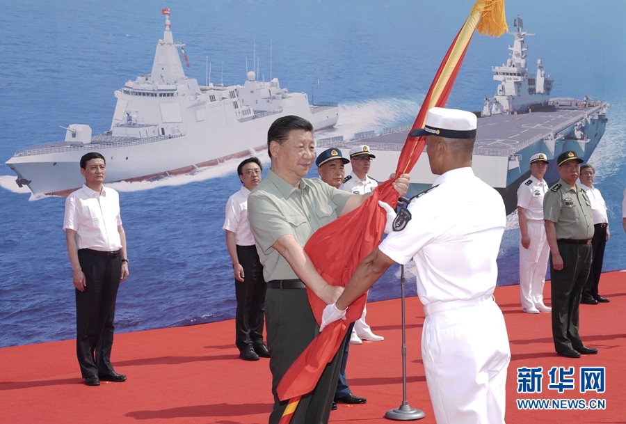 423日,海军三型主战舰艇——长征18号艇、大连舰、海南舰在海南三亚某军港集中交接入列。中共中央总书记、国家主席、中央军委主席习近平出席交接入列活动并登上舰艇视察。这是习近平向海南舰授予军旗、命名证书。 新华社记者 李刚 摄