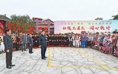 425日至27日,中共中央总书记、国家主席、中央军委主席习近平在广西考察。这是27日上午,习近平在南宁市广西民族博物馆外,同参加三月三“歌圩节”民族文化活动的各族群众亲切交流。