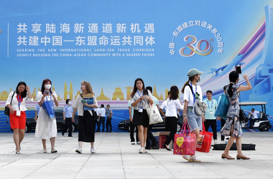 2021年9月11日,在广西南宁国际会展中心,参观者走出第18届中国—东盟博览会展馆。新华社记者 陆波岸 摄